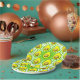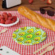 Avocado zeichnend mit Halbtoneffekten auf Bild angewendet. Maßgeschneiderte Teller aus Zierpapier. Hintergrund mit grünen Punkten. Geschenkidee für Avocadoliebhaber jeden Alters.