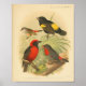 Vintag 1910 Vogelbild. Rote, gelbe und schwarze Vögel, die auf einem Zweig sitzen.