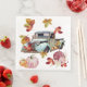 Aquarellfarbene Herbstblätter, rostig orange-rot und goldgrün, treiben durch einen rostigen Vintag blass blauen LKW. Die Verankerung am Boden sind Kürbisse, Blume und Blattwerk mit einigen kleinen Kürbissen, die auf dem "Laufbrett" des Vintagen Fahrzeuges reiten. Fügen Sie Ihren eigenen Text und Ihre Personalisierung hinzu.