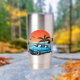 Strandfahrt in einem Vintagen blauen Kreuzfahrer bei Sonnenuntergang mit einer isolierten Flasche zum behalt von heißen oder kalten Getränken.