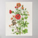 In dieser botanischen Abbildung werden verschiedene Wildblumen in Rot und Orange, einige davon sind Kranesbills, dargestellt. Hintergrund der Papiertextur.