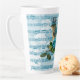 Die Tasse ist Vintag mit Kronen- und Blumenelementen auf einem blau-blau-farbenen Notenhintergrund.