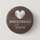 Vintager dunkelbrauner Holzkornknopf für Hochzeitsjacke. Personalisiertes ländliches Abzeichen mit grungenhaftem Herz und eleganter Typografie. Ideal für Junggeselinnen-Abschied, Brautparty, Hochzeitstag, Verlobung etc. Klassisches Runddesign mit rustikalem Holzgestalltenbild. Machen Sie Ihre eigenen schäbigen Accessoires für Trauzeugin, Ehrenmatron, Blume Mädchen, Brautmutter etc.