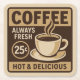 Mit diesem quadratischen Untersetzer aus Pulp-Pappe servieren Sie bei jedem Drink einen Vintagen Stil. Im Retro-Coffeeshop finden Sie die Aufschrift "KAFFEE - Always Fresh - 25™ - Hot & Delicious". Mit seinem nostalgischen Ambiente und seinen bräunlichen Tönen ist es eine unterhaltsame und funktionale Ergänzung zu jeder Ansammlung. Dieser absorbierende Untersetzer mit 4" x 4" und robuster 50 pt Zellstoffplatte eignet sich hervorragend für Party, Empfänge oder den Alltag. Dauerhaft und dennoch verfügbar, fügt es eine personalisierte Touch hinzu und schützt Ihre Oberflächen vor Wasserringen und Verschütten.