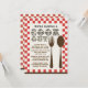 Diese rustikale GRILLEN im Stil des Westerns kann für Ihre nächste GRILLEN im südlichen Stil oder für jede Art von Backhofkost verwendet werden. Versammelt eure Freunde und Nachbarn und macht Spaß. Im Hintergrund befindet sich ein kariertes Muster in weiß und rot als klassisches Tischdecken, geschrieben "We are have a cookout" in extravaganten Vintagen Schriftart. Illustriert von einer Gabel und einem Löffel.