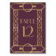 Diese elegante, Vintag inspiriert Hochzeitskarte mit einer geometrischen Rahmen aus Imitaten mit goldfarbenem Deko auf bordeauxrotem Hintergrund. Das Wort "Tisch" erscheint im goldfarbenen dekorativen Schriftart der 20er Jahre. (Bearbeiten Sie die Tischnummer für jede einzelne Karte separat.)