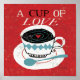 © Michael Mullan / Wild Apple. Eine Vintag aussehende Tasse Kaffee gegen einen roten schwarzen Boden. Die Worte A Cup der Liebe sind auf dem Bild geschrieben.