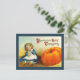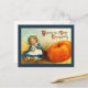 Vintage Erntedank Bild eines kleinen Mädchens in einem blauen Kleid, das einen Löffel hält und einen Kürbis anschaut. In der rechten oberen Ecke steht "Glückliches Erntedankfest wünschen".