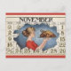 Diese Postkarte zeigt eine Vintage Abbildung einer Frau mit einem Teller Truthahnkreuz-Set gegen den November-Kalender. Genießen Sie Ihre neue Vintage Erntedank Kalender Postkarte!