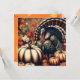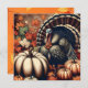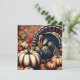 Eine Vintage Postkarte, um das nostalgische Gefühl des Erntedanks aufzurufen. Ein niedlicher Truthahn, Kürbisse und Herbstlaub.