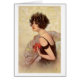 Eine Vintage Illustration von Tito Corbella ist ein Portrait eines schönen jungen Flappers mit kurzen, dunklen Glockenspielen. Sie trägt ein gekleidetes Kopfband und einen roten Lippenstift. Ihr Kleid ist schwarz mit nackten Schultern, Armen und Rücken, und sie hält eine rote Blume bis zur Brust. Der Künstler Tito Corbella (1885-1966) war geboren in Pontremoli, Italien, und starb in Rom, Italien. Er unterschrieb sein Kunstwerk mit "T. Corbella" und war vor allem für seinen italienischen Deko-Stil bekannt. Seine Liebe von wunderschönen Frauen, Mode und Glamour zeigt sich in den mehr als 300 Bildern, die er gemalt hat und oft auf Postkarten verwendet wurden. Diese Karte ist leer für Ihre eigene Nachricht.