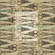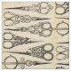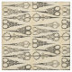 Eleganter gemusterter Stoff mit Vintagem Dekorationstil aus antiken Scheren und neutralem beigefarbenem Pergament-Papier. Schönes viktorianisches Friseur-Design, um Ihre Salongegenstände wie Kaps, Masken oder andere individuelle Gegenstände zu kreieren.