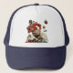 Vintage Abbildung Sportfußballdesign mit einem Spieler und Hund, der ein Spiel spielt. Das Viertelfinale hat den Ball und läuft an dem Bulldoggen Maskottchen und den Initialen HP vorbei, um einen Touchdown zu machen.