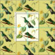 Zwei hellgrüne Kolibris mit Schwarzweiss-Gesichtsmasken hocken auf einer tropischen Rebe mit hellen gelben Blumen. Dargestellt auf einem hellgelben Hintergrund; ausgewählt "fertigen Sie ihn" zur Änderungshintergrundfarbe besonders an.