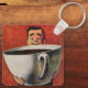 Vintage Illustrationsgetränke und Getränke Design mit einem lächelnden Mann mit einer riesigen heißen Tasse Kaffee, Tee oder vielleicht sogar heißen Schokolade! Das komische, alberne und humorvolle Bild unterstreicht unsere Liebe mit Kaffee!