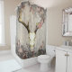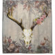 Eine heftige Hirschskulptur mit Blume und Pfauenfedern in ihren Antlers montiert auf einem Vintagen, sepiatfarbenen Hintergrund, gerahmt durch Stammesmuster.