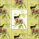 Muster eines grünen Kolibris mit weißem Hals und Brust, der auf einer tropischen Puffsessel-Pflanze mit rosa Blume sitzt. Auf einem hellgelben Hintergrund angezeigt. Wählen Sie "Anpassen", um die Hintergrundfarbe zu ändern.