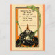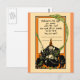 Eine hübsche, Vintage Einladung einer alten Hexe, die einen schwarzen Mantel und einen spitzen Hut trägt. Sie hat weiße Haare und hält ein Holzstab. Die Hexe braut ein Skelett in einen riesigen, schwarzen Kessel. Sie ist bei ihren bekannten Tieren, einer schwarzen Eule und einer schwarzen Katze. Grüner Rauch, oder Dampf, kommt aus den Augenhöhlen des Kessel-Skeletts. Auf dem Gruß heißt es: "Hallowe'en is the night for revels, schließe dich dem Spaß an! Wir wollte allen Freunden hier zu sein, du bist einer!" Ideal für diejenigen, die alte, Vintage Grüße, Hexen, Eulen, schwarze Katzen, Skelette oder unheimliche Halloween-Dinge Liebe haben.