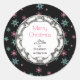 Ein personalisierter (mit Ihrem Namen) Frohe Weihnachtsaufkleber. Der Hintergrund ist schwarz mit rosa und blauen Schneeflocken. In der Mitte befindet sich ein Vintager extravaganter Kreis mit Ihrem personalisierten Text: Frohe Weihnachten (kann auf Anzug Ihrer Bedürfnisse geändert werden - wie Happy Holidays oder Frohe Festtage etc..), sowie ein extravaganter Text-Trenner und Ihr individueller Name. Ideal, um an Umschlägen und Geschenken festzuhalten.