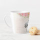 Eine latte Tasse mit einer Vintagen boho-artigen Aquarellbilderung. Ein alter LKW mit einem Strauß Blume hinten. Ein schönes Bild mit Flair auf dem Land. Hübscher Rosenstrauß entlang der oberen Grenze. Hintergrund ist ein verblasstes Vintages Collage Muster.