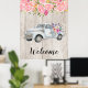 Ein Poster mit einer Vintagen boho-artigen Aquarellbild. Ein alter LKW mit einem Strauß Blume hinten. Ein schönes Bild mit Flair auf dem Land. Hübscher Rosenstrauß entlang der oberen Grenze. Hintergrund ist eine verblasste Holzstruktur (Bild).