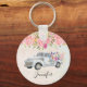 Ein Schlüsselanhänger mit einer Vintagen boho-artigen Aquarellbild. Ein alter LKW mit einem Strauß Blume hinten. Ein schönes Bild mit Flair auf dem Land. Hübscher Rosenstrauß entlang der oberen Grenze. Hintergrund ist ein verblasstes Vintages Collage Muster. Personalisieren mit einem Namen.