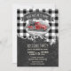 Mit dieser rustikalen Designerplakette laden Sie Ihre Weihnachts-Party-Gäste stilvoll ein. Das Design ist mit einem Vintagen, roten Lieferwagen-LKW in einer schneebedeckten Retroszene mit Rädern ausgestattet. Oben ist ein graues Banner mit Ihrem Firmennamen und unter Ihren Party-Details, damit Sie Ihre persönlichen Daten personalisieren können. Im Hintergrund stehen die karierten Büffel- und Pinienbäume in Weiß und Schwarz. Entworfen von dem weltbekannten Künstler ©Tim Coffey.