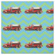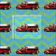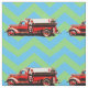 Roter Vintager Feuerwehrwagen auf einem hellgrünen Zickzackhintergrund.