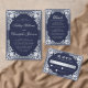 Eine Vintage marineblaue Hochzeitsfeier mit dem Namen des Gastes und der Tischnummer auf der Vorderseite, den Braut- und Bräutigam-Namen und dem auf der anderen Seite gedruckten Hochzeitstag (d.h. die andere Hälfte, bevor sie zusammenfällt). Es hat einen antiken Rahmen mit Imitaten silberne Folie Dekorationen und auch Imitate silber innen (auf der Rückseite, vor dem Falten). Der gesamte Text ist grau, in eleganter Kalligraphie geschrieben. Der Hintergrund ist marineblau. Größe: 4,5" x 5,6" vor dem Falten, das sind 4,5" x 2,8" nach dem Falten.