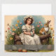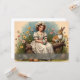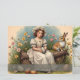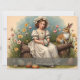 Ein junges Mädchen in einem eleganten Vintagen Kleid sitzt auf einem Holzlog und hält ein schön dekoriertes Osterei. Umgeben von blühenden Blume und einem neugierigen Kaninchen strahlt die Szene Wärme, Nostalgie und den Geist der Osterzeit aus.
