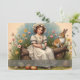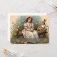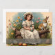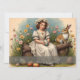 Ein junges Mädchen in einem eleganten Vintagen Kleid sitzt auf einem Holzlog und hält ein schön dekoriertes Osterei. Umgeben von blühenden Blume und einem neugierigen Kaninchen strahlt die Szene Wärme, Nostalgie und den Geist der Osterzeit aus.