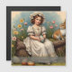 Ein junges Mädchen in einem eleganten Vintagen Kleid sitzt auf einem Holzlog und hält ein schön dekoriertes Osterei. Umgeben von blühenden Blume und einem neugierigen Kaninchen strahlt die Szene Wärme, Nostalgie und den Geist der Osterzeit aus.