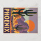 Ein Vintages Reiseplakat vereint eine dramatische Wüstenlandschaft in der Nähe von Phoenix, Arizona, mit einem hohen Saguaro-Kakteen, schroffen Bergen und einer großen, orangefarbenen Sonne vor einem lila und blauen Himmel. "PHOENIX" wird am unteren Rand deutlich dargestellt.