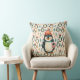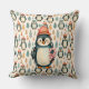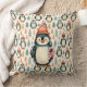 Ein Weihnachtskissen mit niedlichen skurrilen Pinguinen, Bonbons und Kiefernbäumen in Ziegelrot, Gold und Türkis.