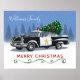 In dieser Wandkunst befindet sich ein Vintages Polizeiauto, das einen Weihnachtsbaum in einer schneebedeckten Szene mit Kiefern hinter sich trägt. Personalisieren Sie Ihren Namen und Gruß. Entworfen von dem weltbekannten Künstler ©Tim Coffey.
