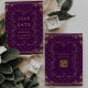 Diese elegante Hochzeitskarte Save the Date weist einen verzierten Vintagen Goldrahmen auf einem lila Hintergrund auf, der ein Vintages Buchcover imitiert. Passen Sie den goldfarbenen Text in stilvollen Schriftart an, und geben Sie Ihre Hochzeitswebsite-URL ein, um einen QR-Code auf der Kartenrückseite zu generieren.