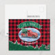 Dieser Urlaub danke Ihnen Post-Karte zeigt eine Winterszene eines klassischen roten Lieferwagen LKW durch den Schnee fahren mit einem frischen Weihnachtsbaum im Hintergrund. Ein grünes Banner oben liest "Liebe & Dank" mit Ihrem Familiennamen unten, um Ihre persönlichen Daten zu personalisieren. Der Hintergrund ist ein klassisches Rot-Schwarz-Büffel-Karo und eine Reihe grüner Kiefern.