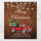 Wasserfarbener Vintager roter LKW und Weihnachtsbaum. Frohe Weihnachts Wein Flasche Etikett. Rustikales Land Holz drucken. Weiße Schrift. String Lights.