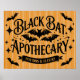 Ein altmodisches, elegantes Typografie-Zeichen für die Black Bat Apothecary, Werbetränke und Elixiere vor einem klassisch orangefarbenen, gestreiften Hintergrund mit Fledermäusen und Sternen