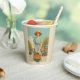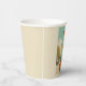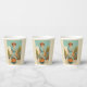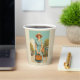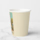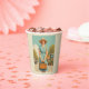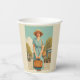 Eine charmante Vintage Abbildung einer Frau in einem blauen Polka-Dot-Kleid und Sonnenhut, die einen Lederkoffer in einer gepflasterten Pariser Straße aufbewahrt, umgeben von blühenden Blume und klassischen Schaufenstern.