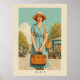 Eine charmante Vintage Abbildung einer Frau in einem blauen Polka-Dot-Kleid und Sonnenhut, die einen Lederkoffer in einer gepflasterten Pariser Straße aufbewahrt, umgeben von blühenden Blume und klassischen Schaufenstern.