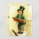 Vintage Abbildung eines niedlichen kleinen Jungen, stehend auf einem Stuhl mit einem geöffneten Buch. Er trägt sein St. Patrick's Day-Kostüm - eine grüne Jacke mit Kleeblättern, Krawatte und Top-Hut mit Pfeife.
