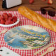 Französische und europäische Reisewerbung - Strand, Dorf, Menschen, Bäume, blaues Meer und Himmelsbild
