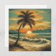 Dies ist ein Bild, das eine Vintage idyllische Outdoor-Szene darstellt. Die dominierende Vordergrundfarbe ist gelb, die dominierende Hintergrundfarbe braun, was zu einer insgesamt warmen Farbpalette beiträgt. Das Bild stellt eine Strandlandschaft mit Palmen dar. Der Himmel über dem Strand ist voll von Wolken, die eine ruhige Landschaft schaffen. Das Bild enthält auch einen Sonnenuntergang, der ein Gefühl von Zeit gibt.