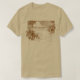 Ein T - Shirt mit einer Vintagen tropischen Ätzung von Palmen an einem Sandstrand und schönen Wolken über ruhige Ozeanwellen in braun.