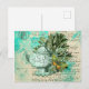 Hübsche Vintage Collage mit minzfarbener Teekopfillustrierung mit Blattwerk und grünem Schmetterling auf pastellgelbem Aqua Not leidender ephemera Hintergrund