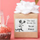 Ein Buchzeichen-Aufkleber mit Sondertext in angesagten, Retrobriefen und ein Schwarz-Weiß-zeichn einer Katze in einem Deckmantel und Schwänzen, der seinen oberen Hut auf einem grauen Imitat Leinwand Hintergrund kippen.