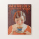 Das schöne Bild einer Frau, die eine warme Tasse Tee oder Kaffee trinkt und ein orangefarbenes Shirt trägt, mit einem schlichten, stylischen Haar der 20er und 30er Jahre. Elegantes Vintages Gemälde für die Deko-Liebhaberin oder Teetrinkerin. Van Nelle's gebroken thee