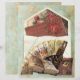 Vintager offener Umschlag mit Beilage, Viktorianischem Ventilator, Hutschachtel und einem alten Buch über Gold und grünes Altpapier. Gold und grünes altes Papier auf der Rückseite