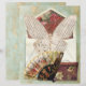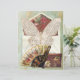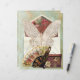 Vintager offener Umschlag mit Beilage, Papierschmetterling, Viktorianischer Ventilator, Hutschachtel über Gold und grünem Altpapier. Gold und grünes altes Papier auf der Rückseite